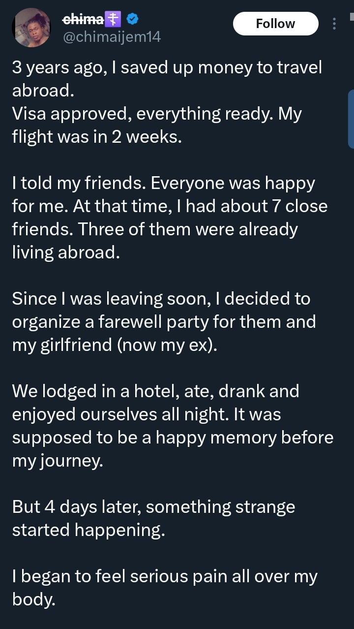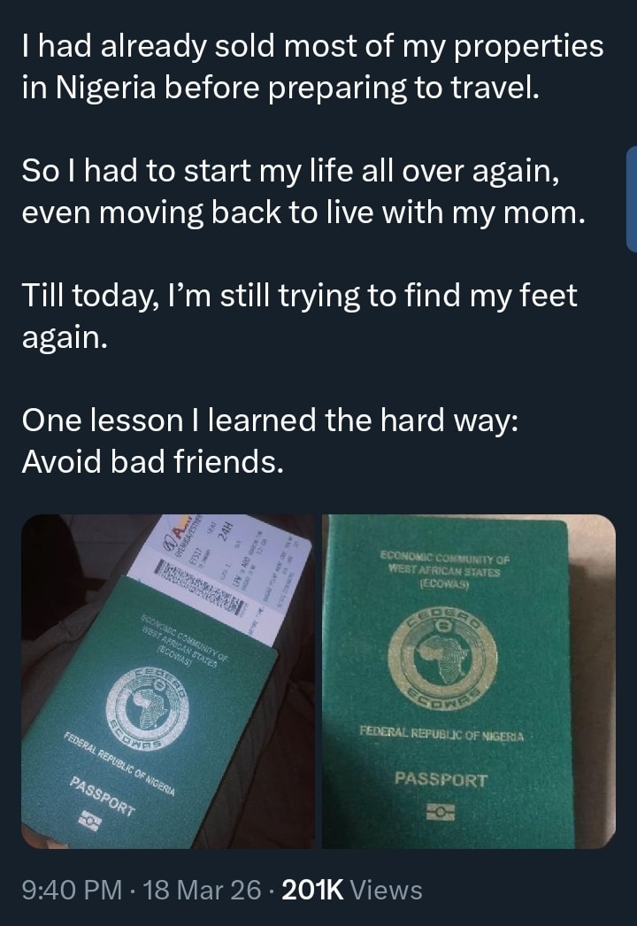A Nigerian man has narrated a troubling experience that disrupted his long-planned trip abroad, leaving him to rebuild his life from scratch.