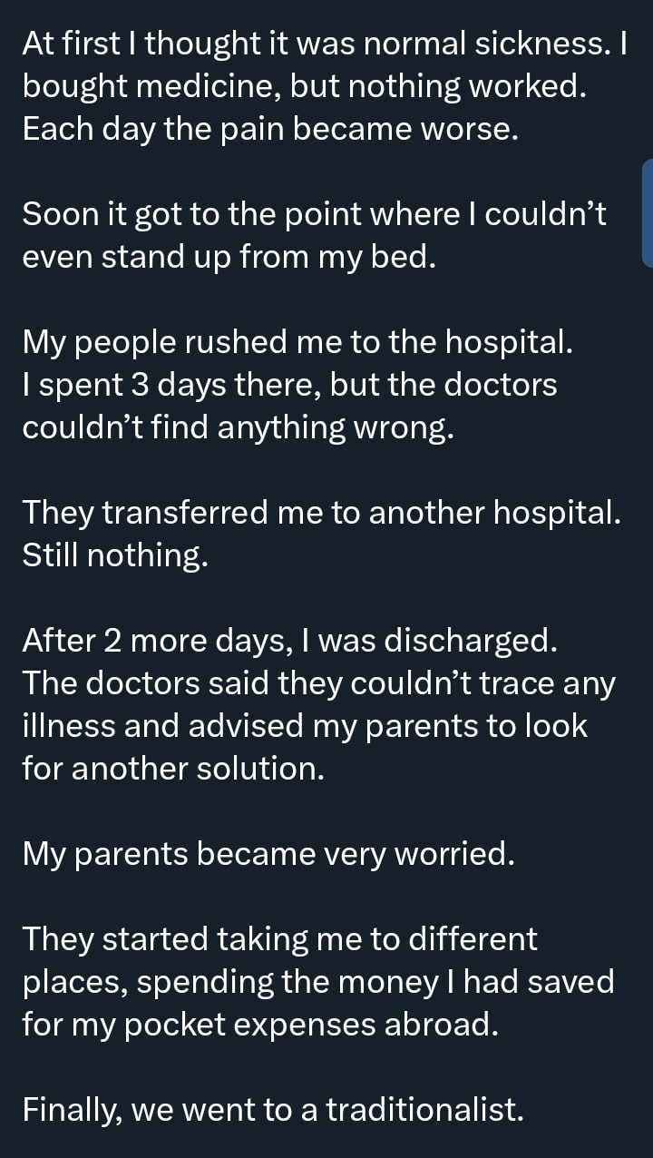 According to the man’s account, the traditionalist warned that a delay of two more days could have been fatal. Treatment was said to have commenced immediately, with a recovery period estimated at three weeks.