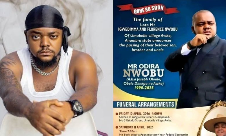“The family of late Mr ODIRA NWOBU Aka Joseph Olonlo ,announces the burial date of their beloved brother, son ,father and uncle, which is taking place on the 11th of April 2026 at No 3 ,Eziudo street ,Umubelle Village Awka ,Anambra state .