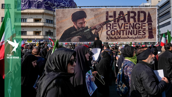 A banner depicting Iran’s new Supreme Leader Mojtaba Khamenei holding a gun is displayed at Enghelab Square in Tehran during the funeral of Iranian commanders killed in US-Israeli strikes [Getty]