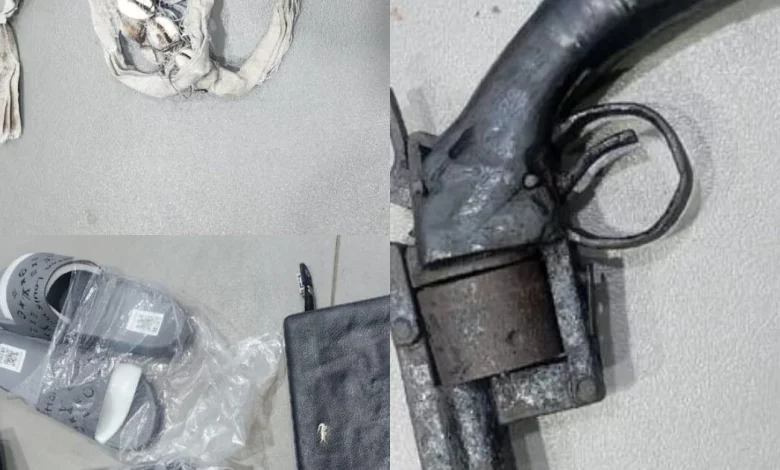 “A search conducted on the bag led to the recovery of one (1) locally made pistol. Other items recovered from him include one black leather purse, charms, and three pairs of slippers,” the police said.