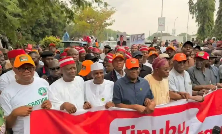 Prominent politicians and members of the African Democratic Congress (ADC) took to the streets of Abuja on Wednesday in a high-profile protest against recent decisions by the Independent National Electoral Commission (INEC), which they claim undermine democracy and the party’s internal leadership.