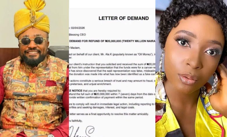 In an official statement released via Instagram, Oil Money’s legal representatives demanded a refund of ₦20 million related to her cancer treatment.